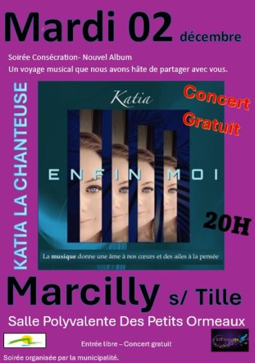 Concert de Katia Caccamo, le mardi 2 décembre à 20h, à la salle polyvalente des petits ormeaux, à Marcilly-sur-Tille. Présentation de son nouvel album : Enfin moi.
