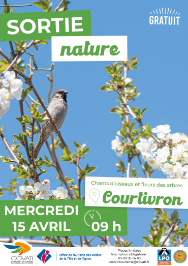 Venez découvrir les chants d'oiseaux et fleurs des arbres, à Courtivron, avec un parcours de 3km aller-retour. Durée : 1h30.